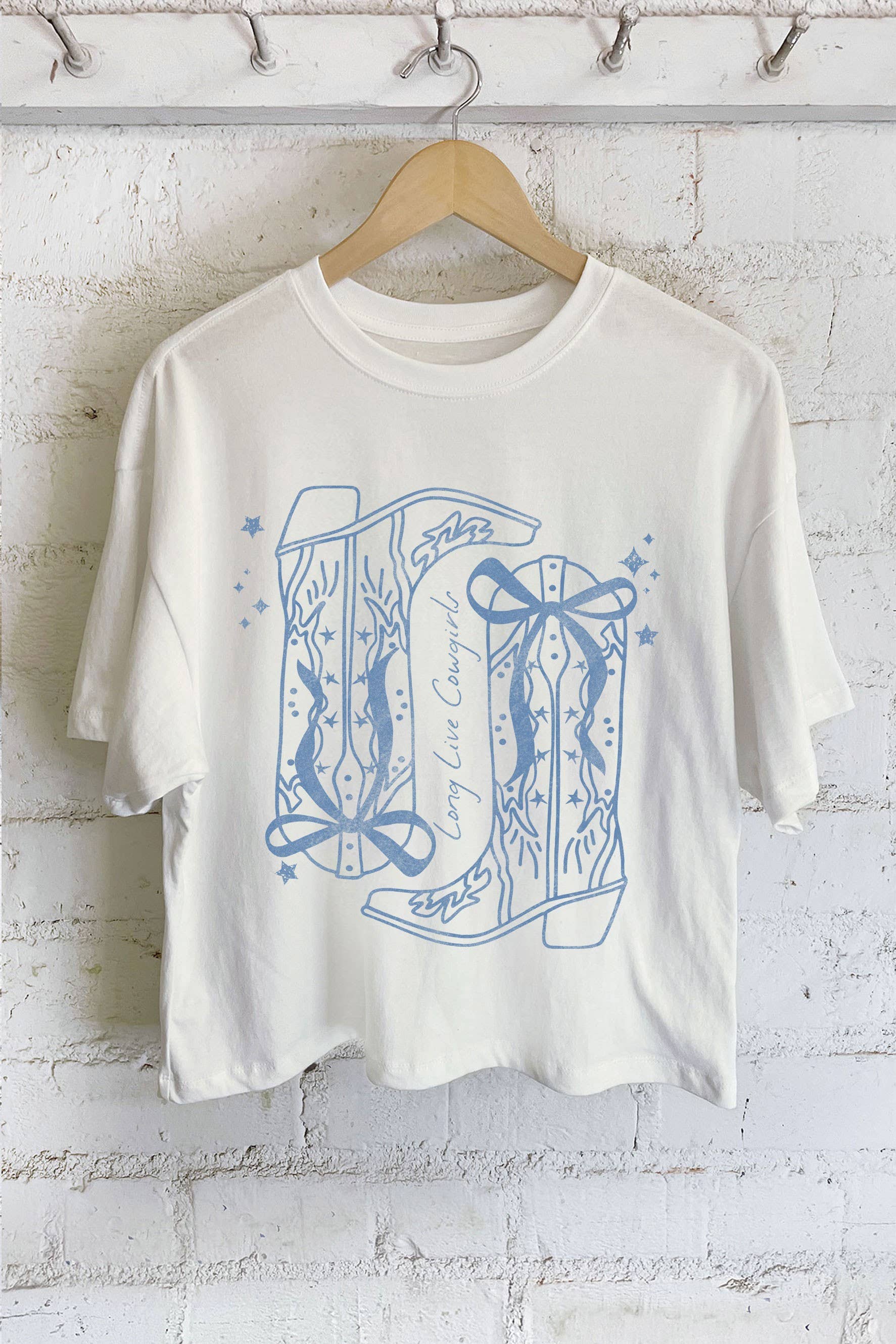 LONG LIVE COWGIRL WESTERN BOW BOOTS GRAPHIC LONG CROP TOP